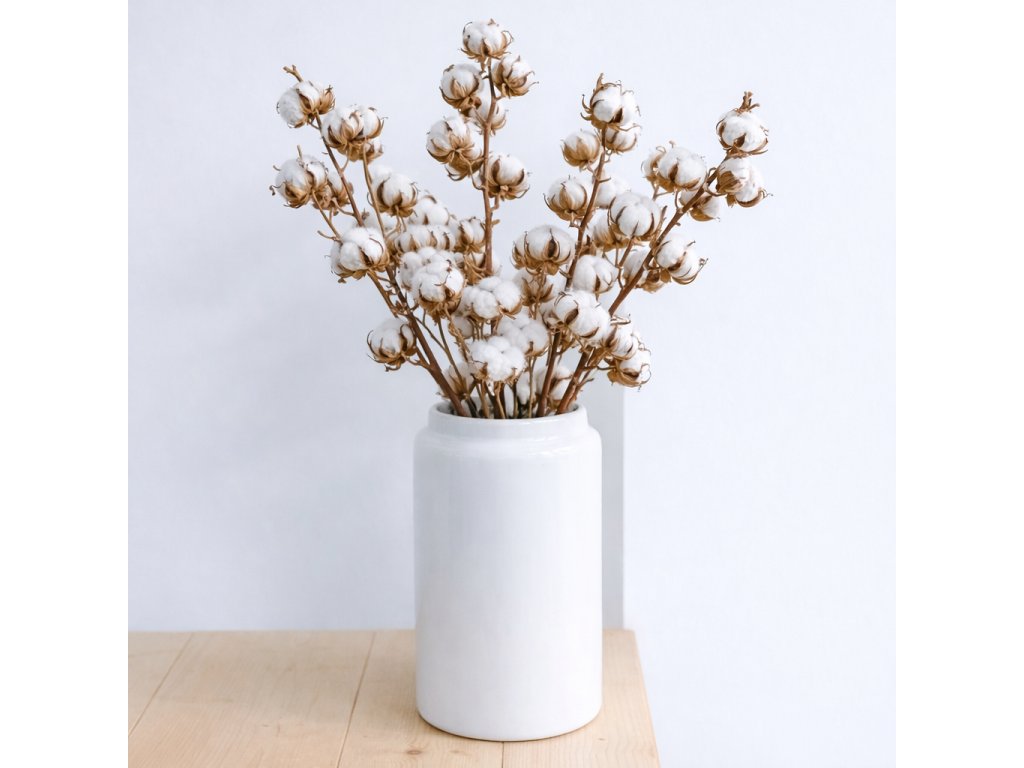 Přírodní větvička bavlníku vnese do interiéru klid, čistotu a nadčasovou eleganci. Díky svému přirozenému vzhledu je ideální do minimalistických i rustikálních aranžmá, vynikne samostatně ve váze i jako součást větších dekorací, věnců či sezónních aranží.
