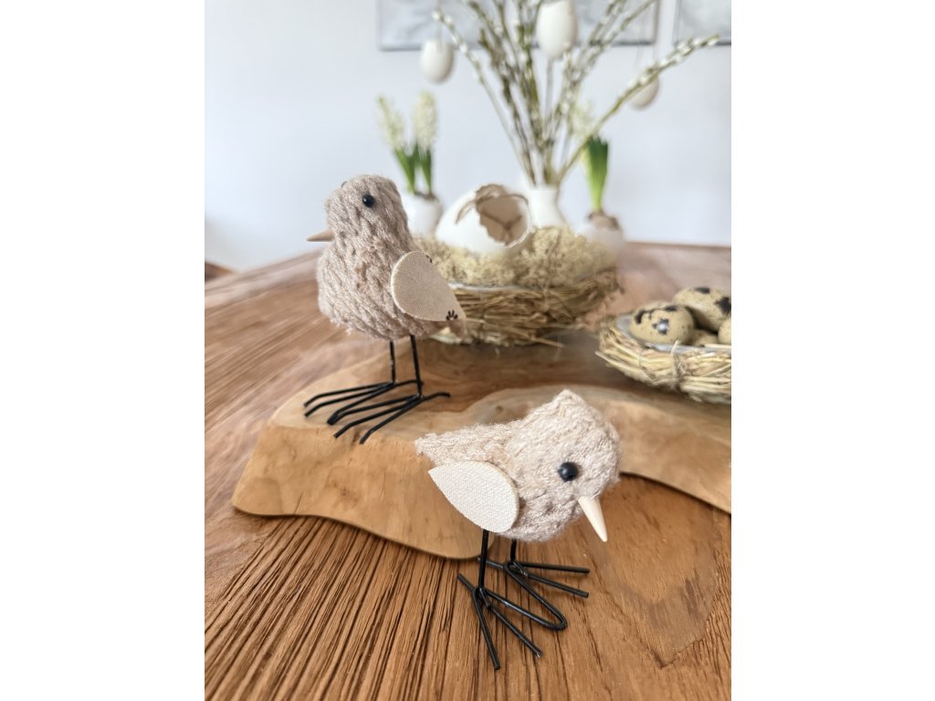 Jemný dekorační ptáček v přírodním béžovém tónu je krásným doplňkem jarní a velikonoční výzdoby. Díky textilnímu povrchu působí měkce a útulně, zatímco kovové nožky mu dodávají stabilitu a lehkost zároveň.