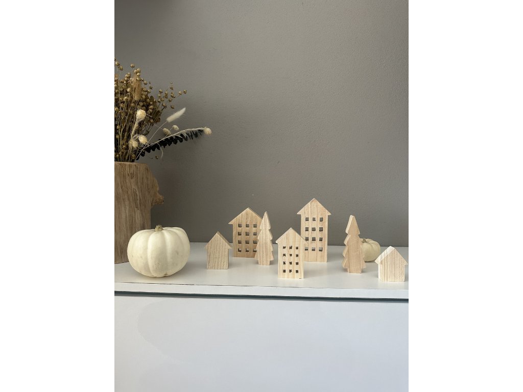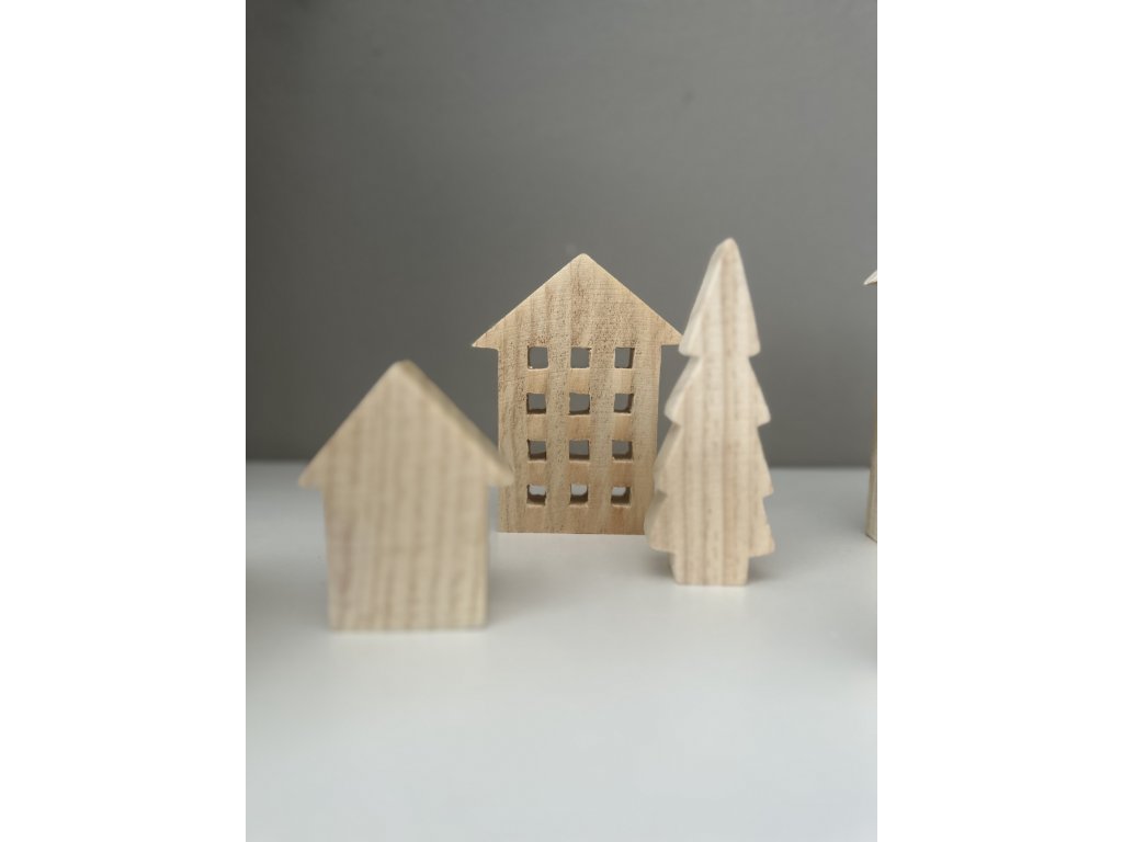 Sada dřevěných domků a stromečků. Balení obsahuje 7 kusů dřevěných dekorací.