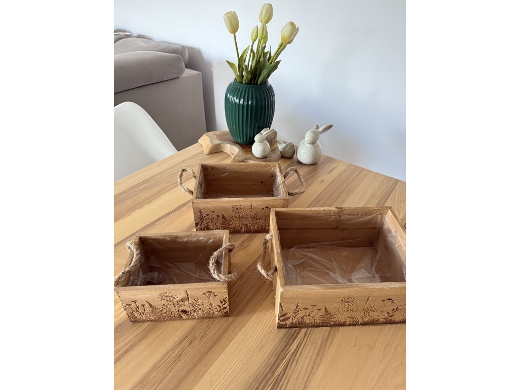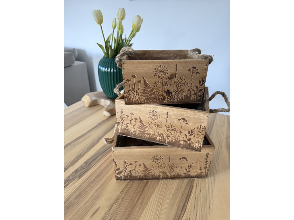 Tyto dekorativní tři dřevěné bedýnky s jemným lučním motivem přinesou do interiéru kousek přírody a útulnou venkovskou atmosféru. Jsou vyrobené z přírodního dřeva, doplněné o vypalovaný květinový dekor a praktická provazová ucha pro snadné přenášení.