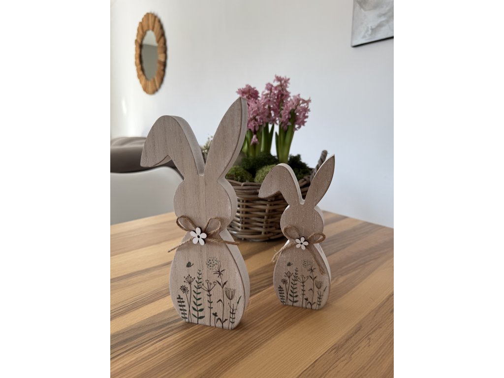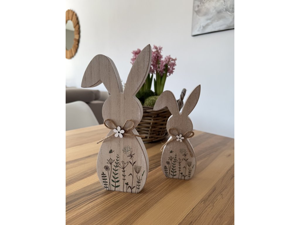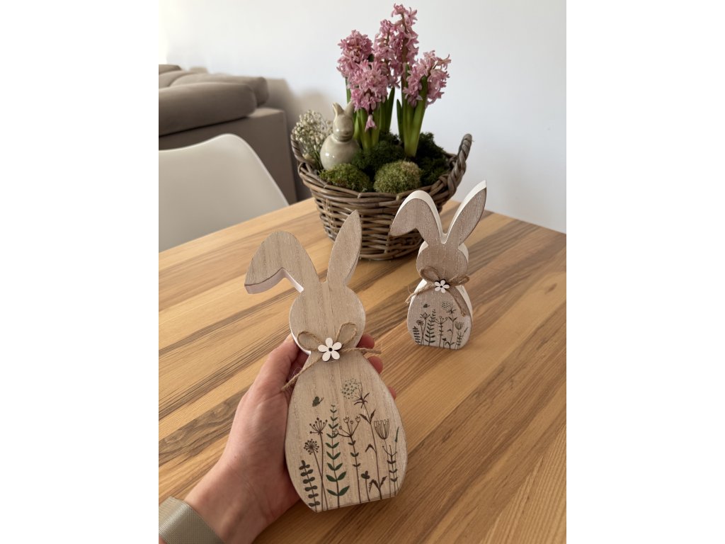 Zajíček je vyroben z přírodního dřeva, zdobený decentním potiskem lučních rostlin a dozdobený jutovým provázkem s malým dřevěným kvítkem. Díky svému nadčasovému vzhledu se hodí nejen jako velikonoční dekorace, ale i jako stylový jarní doplněk do interiéru.