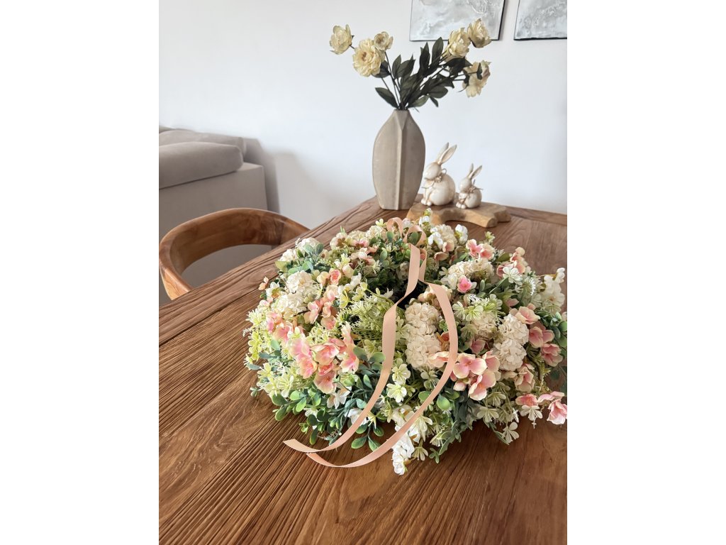 Romantický jarní věnec v jemných pastelových tónech, který vnese do vašeho domova svěžest, lehkost a nádech probouzející se přírody.