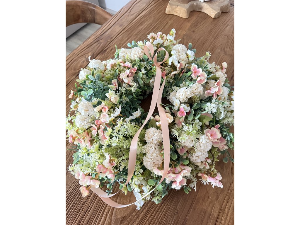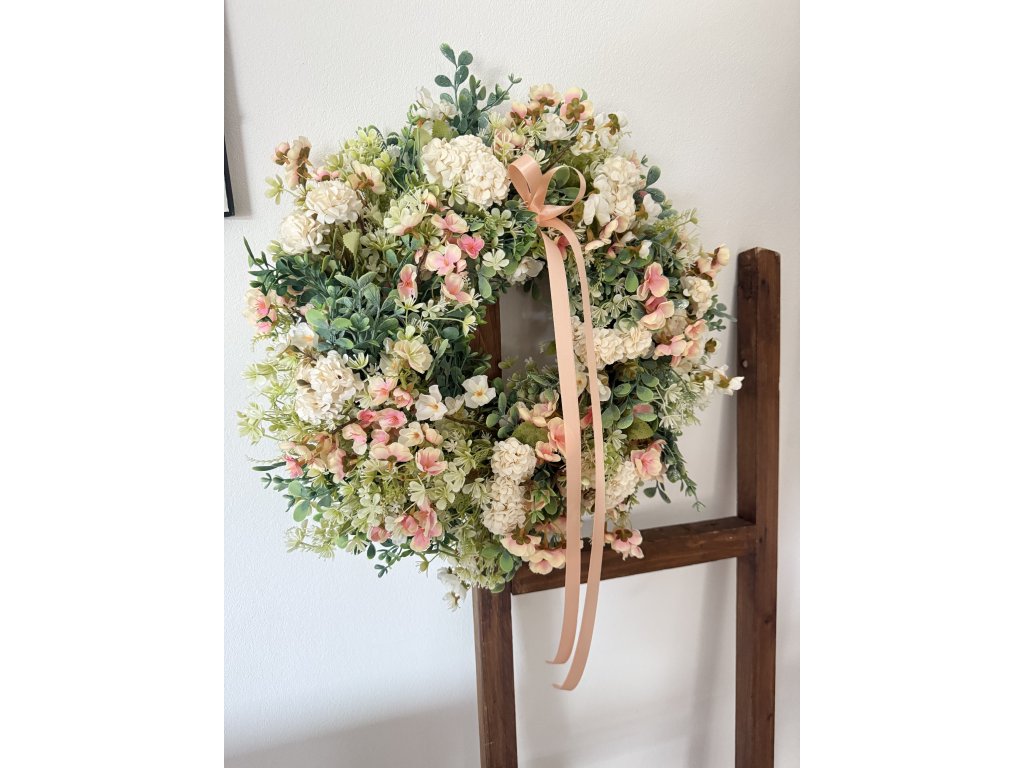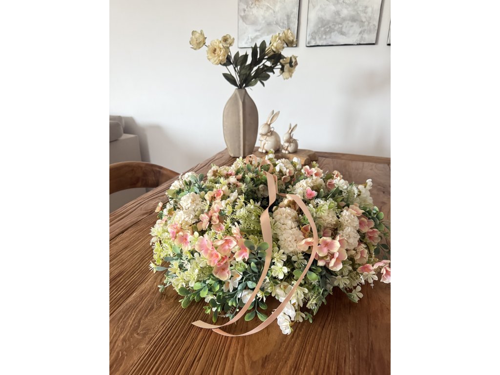 Věnec je vyroben z kvalitních umělých květin a zeleně, díky čemuž si zachová svůj krásný vzhled po celé jarní období – bez nutnosti jakékoliv péče. Kombinace krémových a pudrově růžových květů doplněná svěží zelení vytváří harmonický a elegantní celek. Jemná stuha podtrhuje romantický charakter celého věnce.