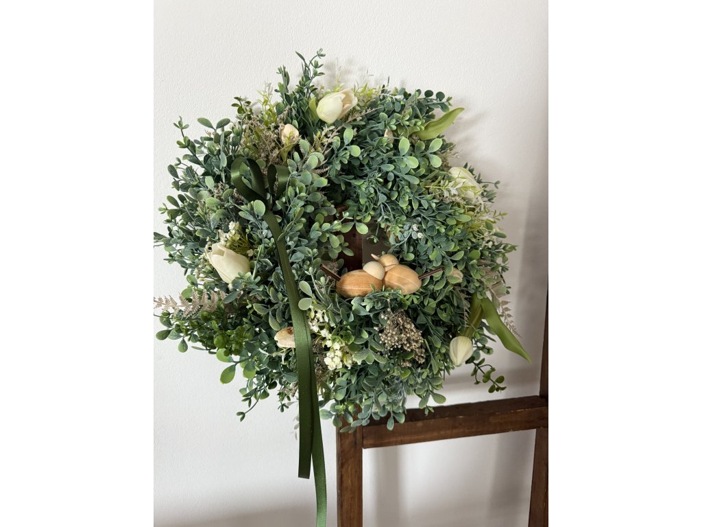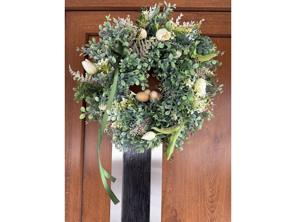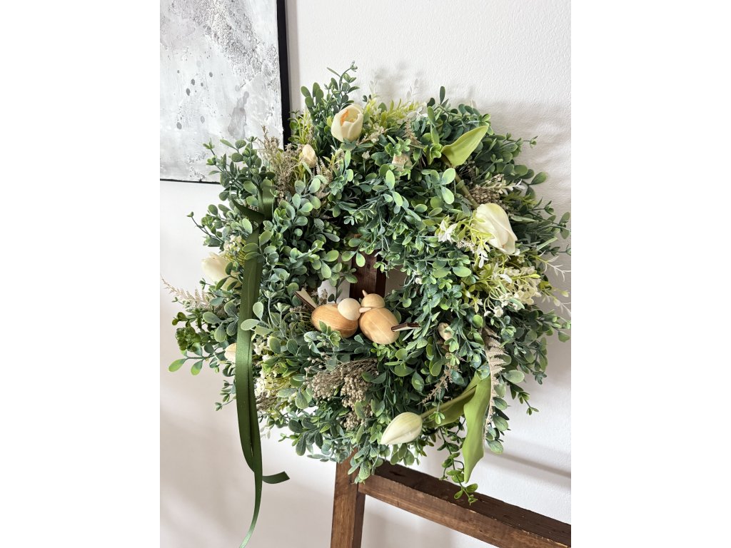 Tento elegantní umělý jarní věnec vyniká bohatým zeleným základem doplněným o jemné krémové tulipány, drobné luční kvítky a přírodní struktury. Dominantním a velmi milým detailem jsou ručně opracovaní dřevění ptáčci, kteří věnci dodávají útulnou, domáckou atmosféru.