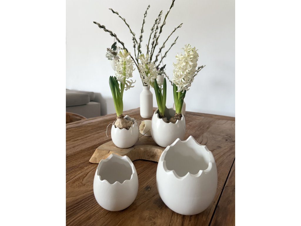 Minimalistická keramická skořápka ve tvaru prasklého vejce je elegantním doplňkem jarní i celoroční výzdoby. Díky čistému bílému provedení krásně vynikne jak v moderním, tak v přírodně laděném interiéru.