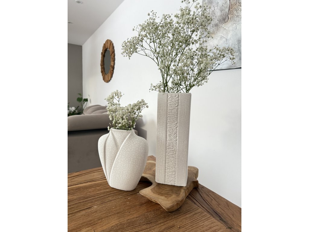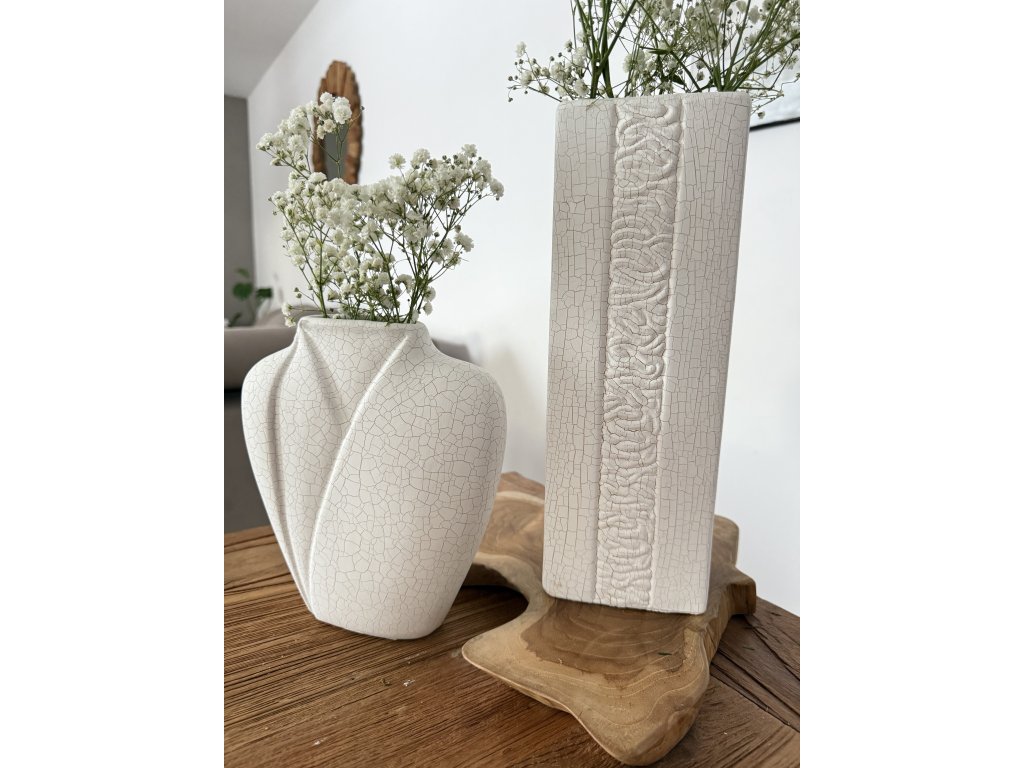 Stylové keramické vázy v jemném bílém odstínu jsou navrženy především jako dekorace pro suché a umělé květy. Jejich povrch zdobí jemná krakeláž, která vytváří přirozený, lehce rustikální vzhled a dodává každému kusu osobitý charakter.