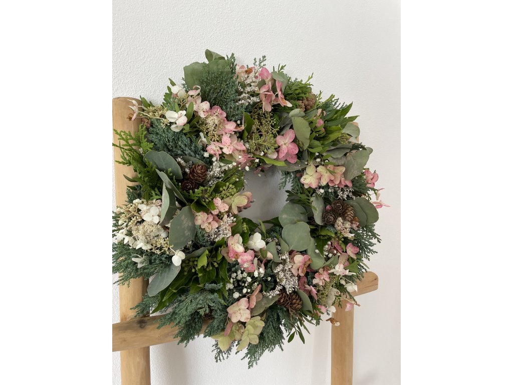Něžný věnec, který je vyroben z túje, břečťanu, eucalyptu a hortenzie.