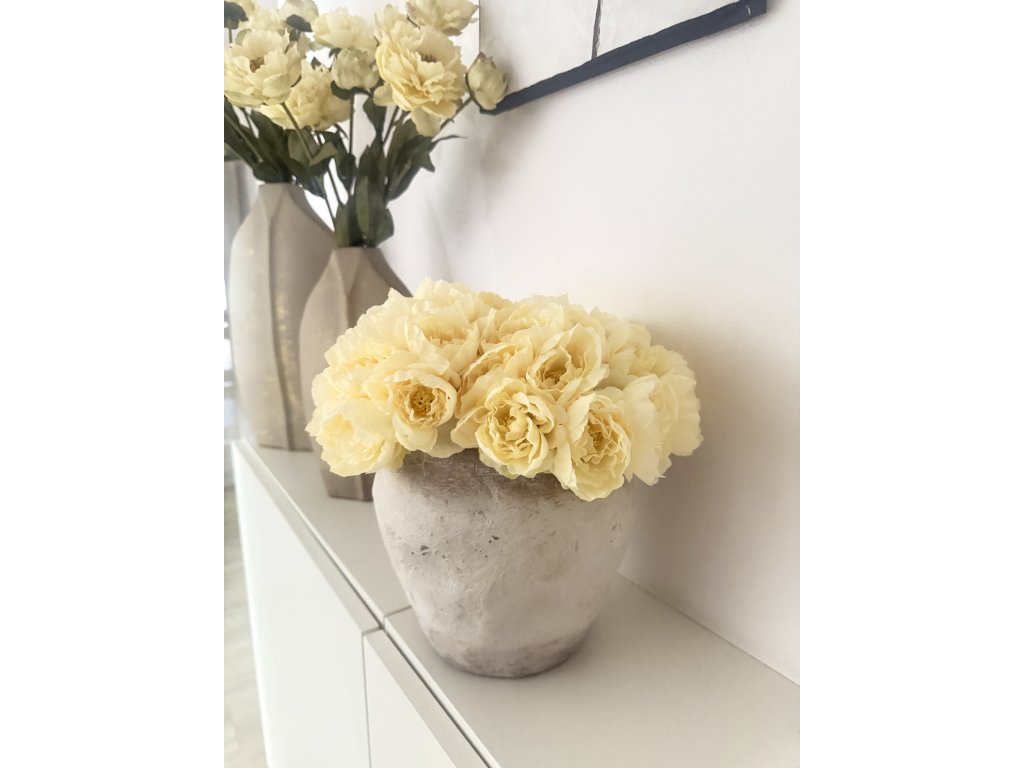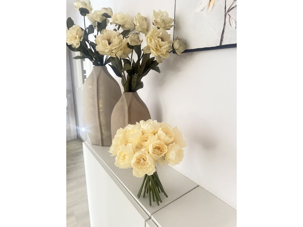 Elegantní svazek 18 umělých pivoněk v jemném krémovém odstínu, který působí velmi přirozeně a nadčasově. Květy jsou bez listí, díky čemuž vynikne jejich plný tvar a svazek působí čistě, minimalisticky a luxusně.