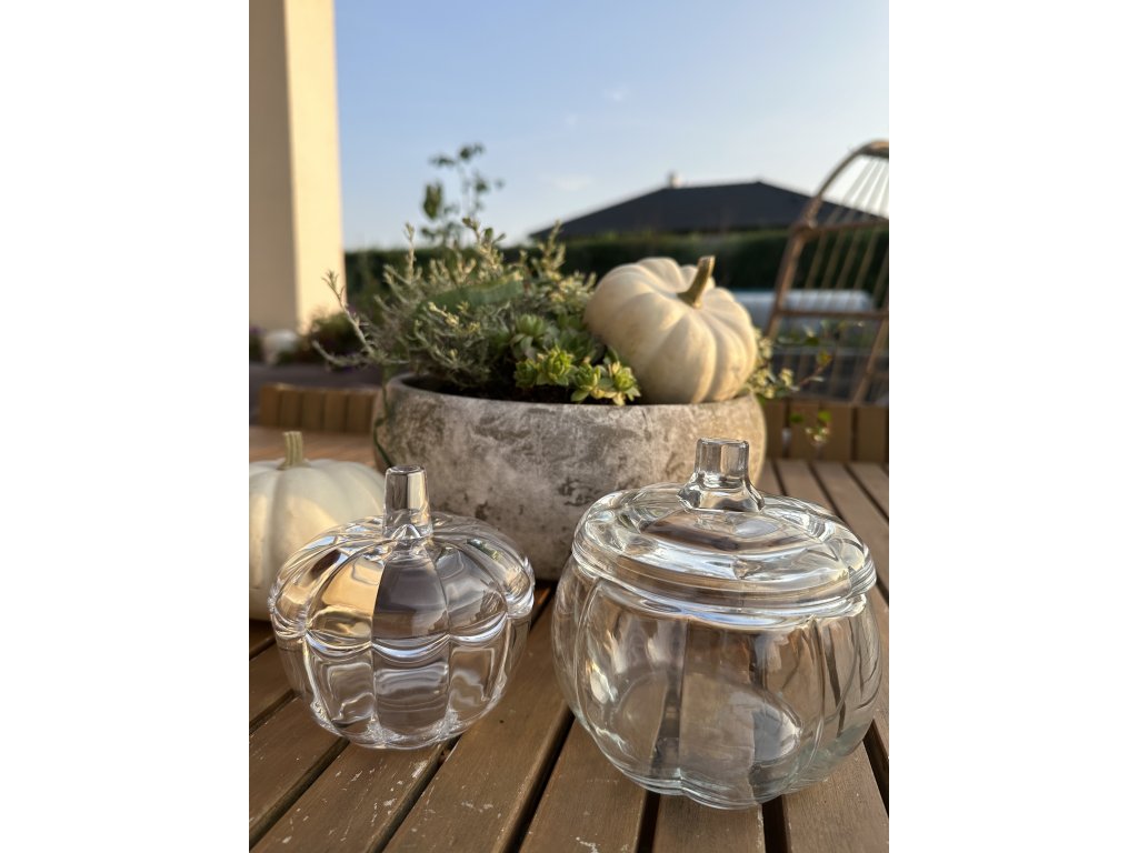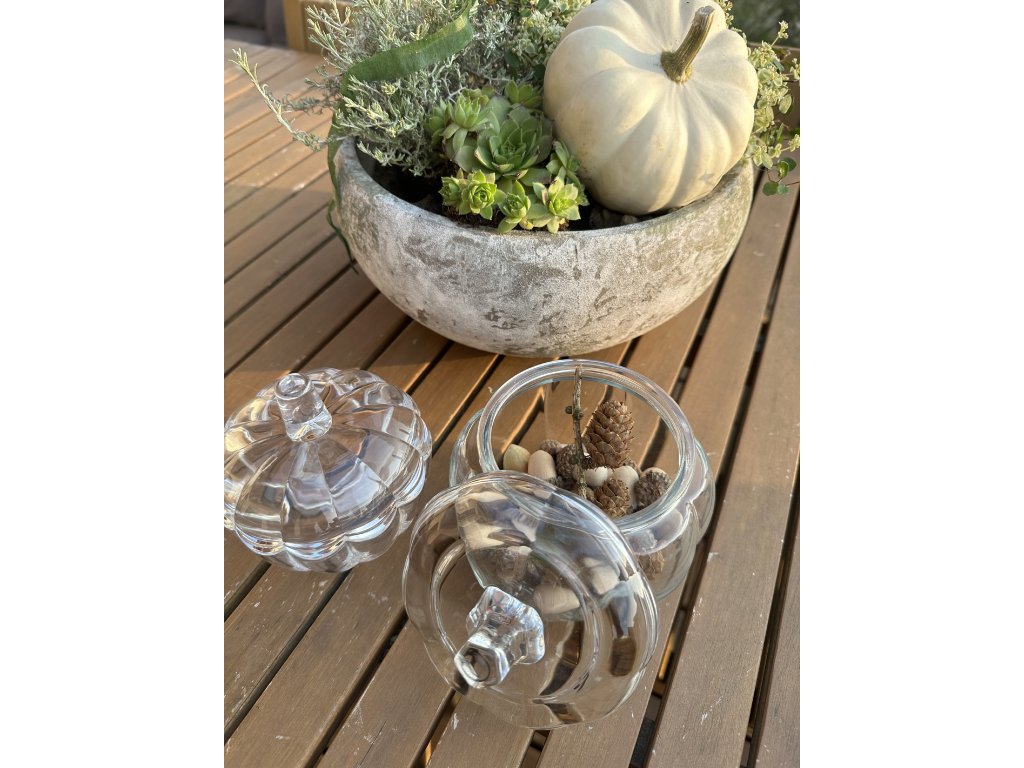 Roztomilé dýně ve skleněném podání. Výrobek slouží jako dekorační dóza.