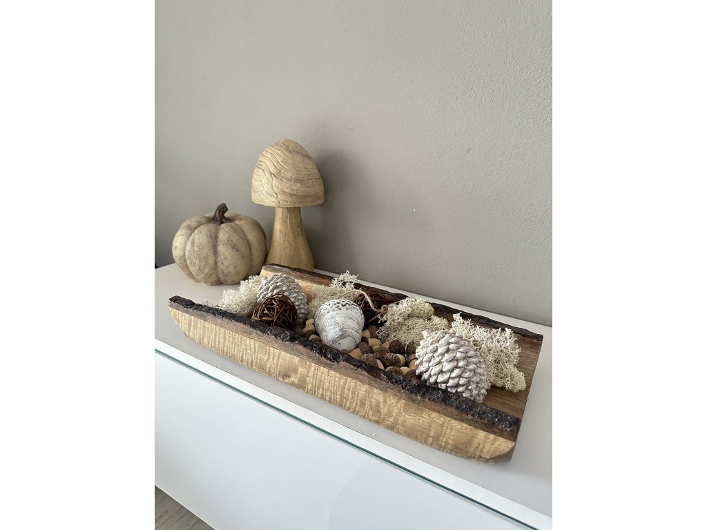 Tác je vyroben z masivního dřeva a je nápaditě po okrajích zdoben kůrou stromu.