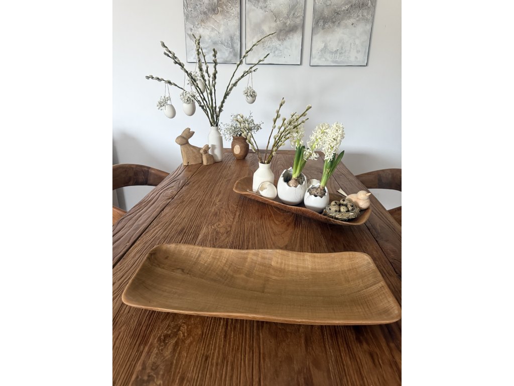 Podélná mísa z masivního teakového dřeva zaujme svým čistým tvarem, jemnou kresbou a přirozenou strukturou materiálu. Každý kus je originál – dřevo nese svou vlastní kresbu, odstín i drobné nepravidelnosti, které podtrhují jeho autentický charakter.