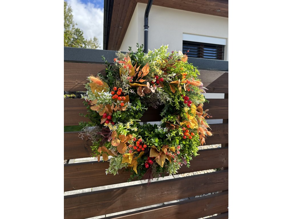 Podzimní věnec z čistě z umělých materiálu, které vypadají téměř jako živé rostlinky.
