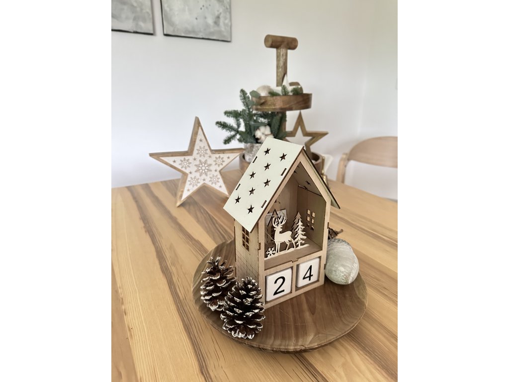 Dřevěný domeček s LED svícením v teplé bílé barvě.
