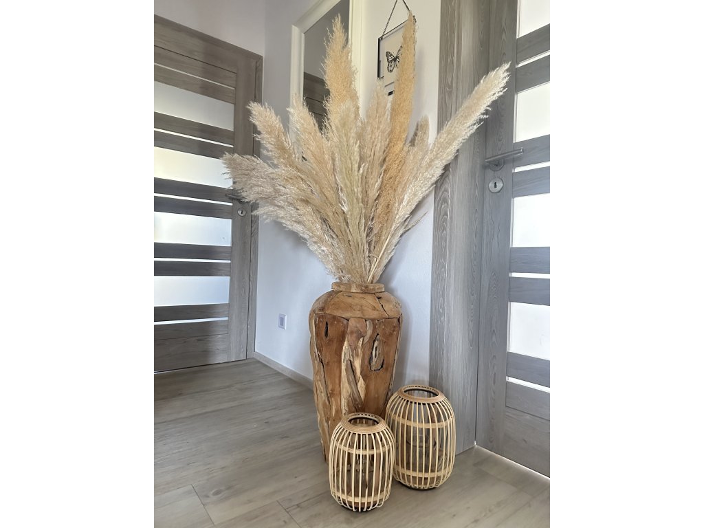 Tato dekorativní váza je zhotovená z extrémně odolného teakového dřeva, které již prošlo procesem smršťování, bylo uměle vysušené a poté jemně a dohladka obroušené. Jde o jedinečný a masivní kousek, který se hodí do vašich interiérů či teras.